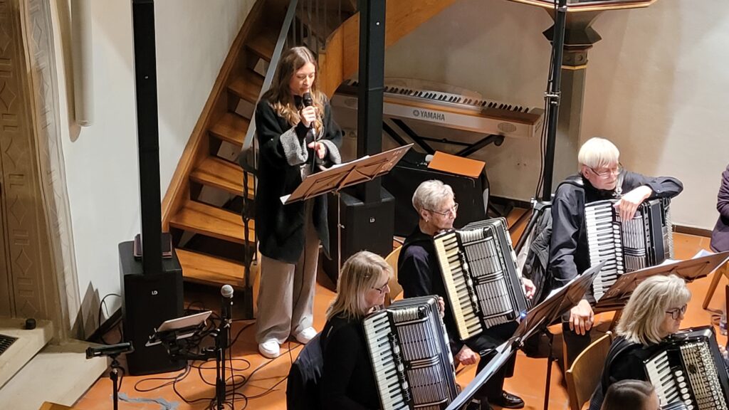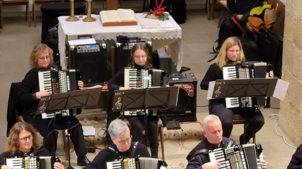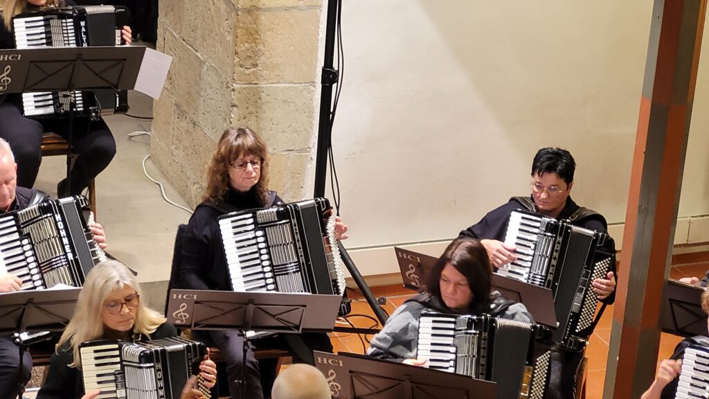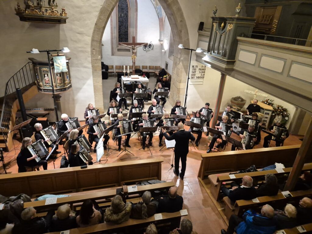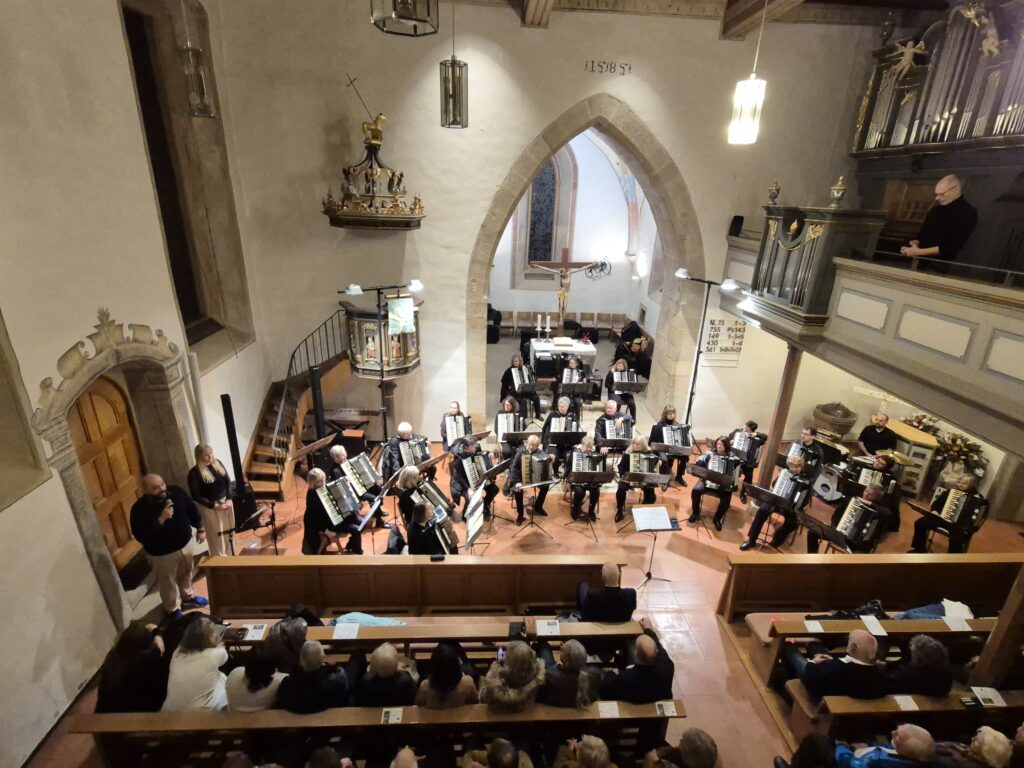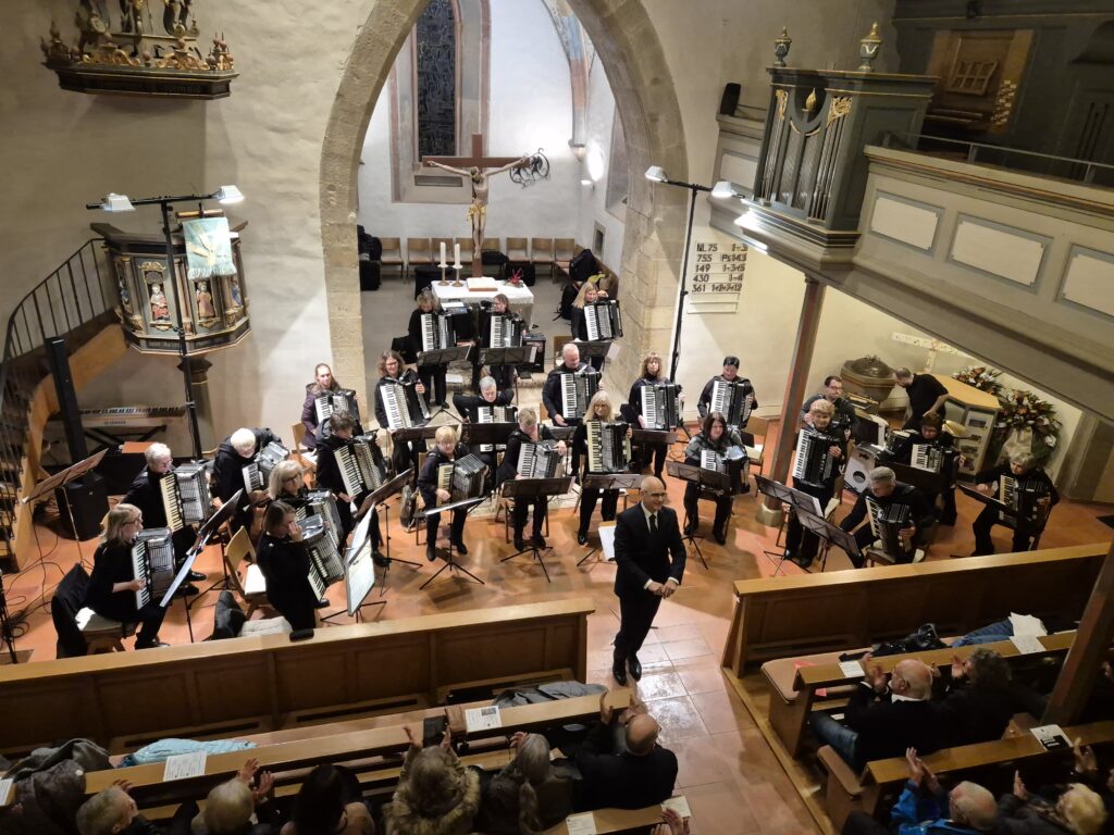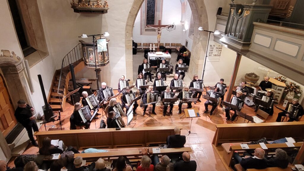 Mit einem festlichen Konzert gastierte das 1. Orchester des Harmonika-Club Ilsfeld unter der Leitung von Klaus Berger am vergangenen Wochenende in der Ulrichskirche Eberstadt. Schon zu Beginn machte der Vorsitzende Wolfgang Schilling in seiner Begrüßung deutlich, welch besonderer Rahmen eine Kirche für ein solches Musikerlebnis ist: „Eine Kirche wie diese ist ein ganz besonderer Raum – die alten Mauern, das gedämpfte Licht, die Stille, die hier herrscht, schafft eine einzigartige Atmosphäre. Musik klingt hier anders, intensiver, berührender.“ – Worte, die sich im Verlauf des Abends eindrucksvoll bestätigten.
