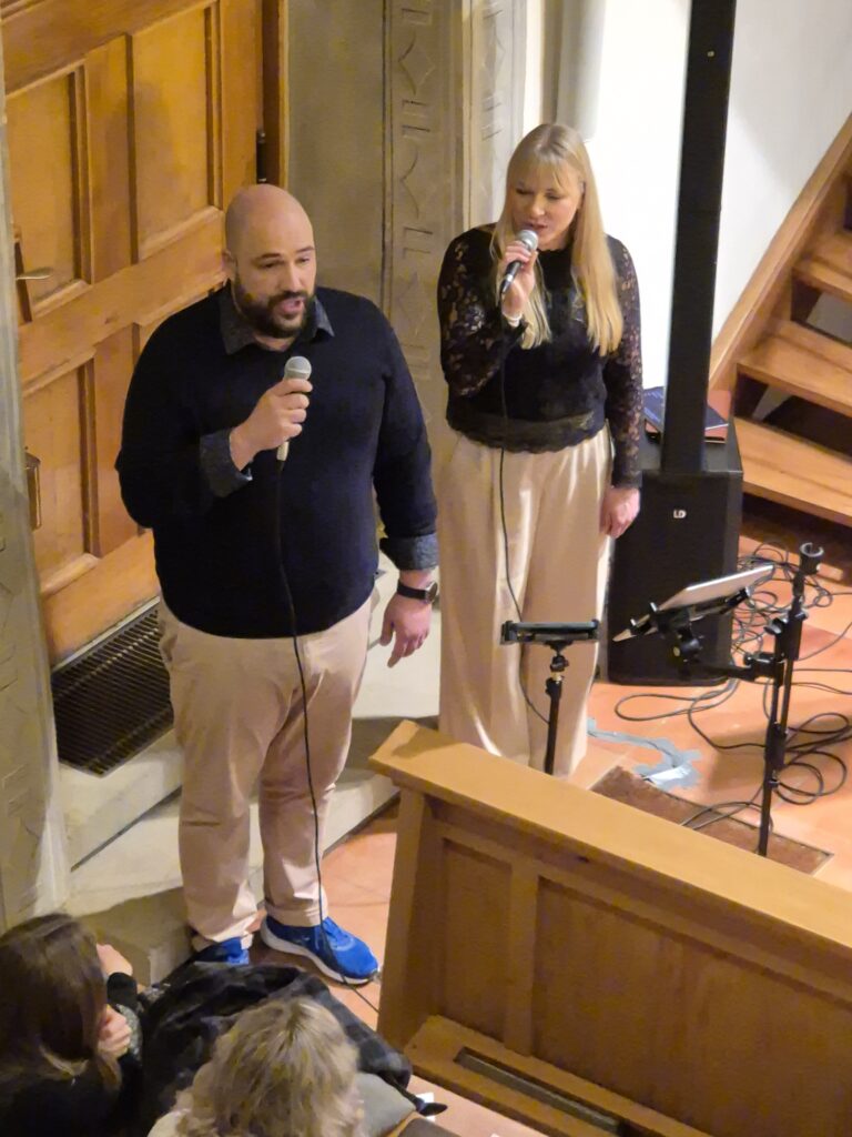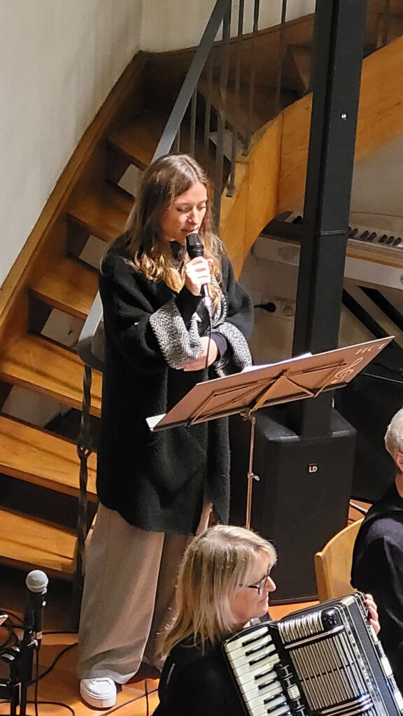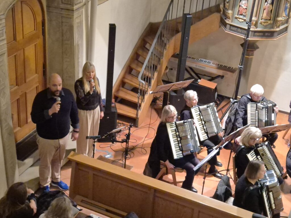 Durch das Programm führte mit angenehmer Stimme und interessanten Hintergrundinformationen Amelie Schilling. Der Abend wurde außerdem bereichert durch das Gesangsduo „Klangmomente“ – Lisa & Ben. Obwohl das gleiche Programm wie in der Woche zuvor in der Ilsfelder Bartholomäuskirche auf dem Programm stand, wurde dieses Konzert zu etwas Besonderem: Mit Lisa als zusätzlicher Stimme konnten nun auch bewegende Duette erklingen – darunter „In Palästen geboren“ aus Ludwig, „Musik der Nacht“ aus Phantom der Oper, „Solang ich dich hab“ aus Wicked sowie „Du allein“ aus Starlight Express.
